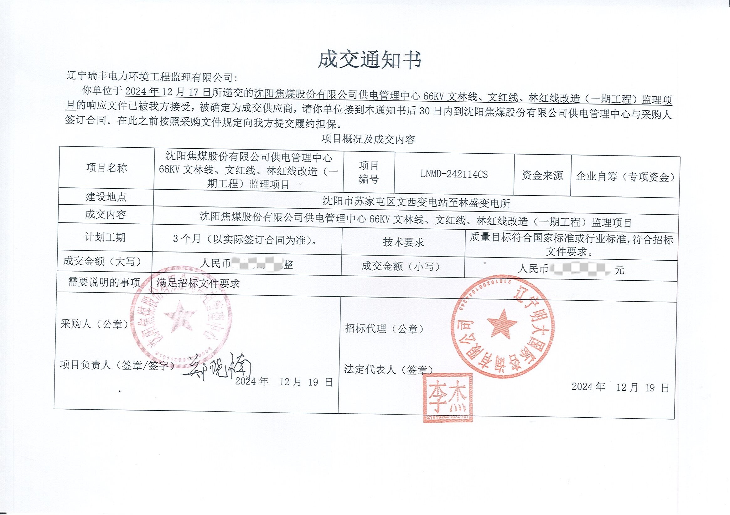 中標(biāo)喜訊-沈陽焦煤股份有限公司供電管理中心 66KV 文林線、文紅線、林紅線改造(一期工程)監(jiān)理項(xiàng)目