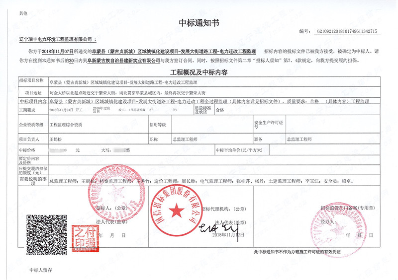 中標(biāo)喜訊-阜蒙縣(蒙古貞新城)區(qū)城鎮(zhèn)化建設(shè)項(xiàng)目-發(fā)展大街道路工程-電力遷改工程監(jiān)理